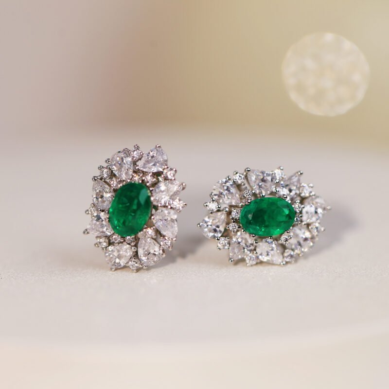 Oval Lab-Grown Emerald Stud Earrings with Pear & Round Zirconia Halo – Gold Plated Silver with Silver Ear Backs