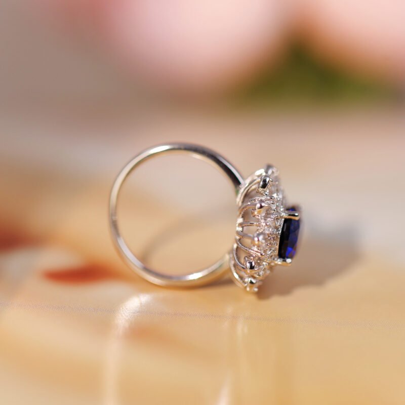 Oval Lab-Grown Sapphire Ring with Pear-Shaped Zirconia Sunflower Design – Rhodium Plated Geometric Aesthetic Ring