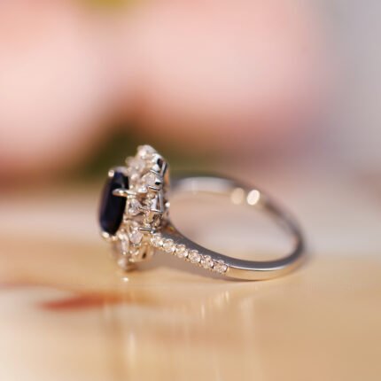 Oval Lab-Grown Sapphire Ring with Pear-Shaped Zirconia Sunflower Design – Rhodium Plated Geometric Aesthetic Ring